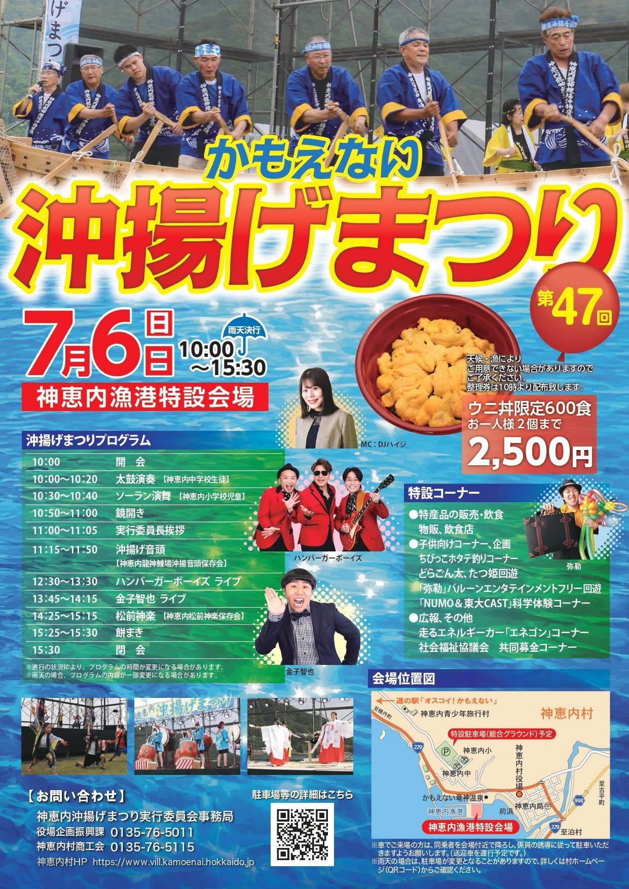 【出演】太鼓演舞(神恵内中学校生徒) / ソーラン演舞(神恵内小学校児童) / 沖揚げ音頭(神恵内龍神鰊場沖揚音頭保存会) / ハンバーガーボーイズ / 金子智也 / 松前神楽(神恵内松前神楽保存会) / MC:DJハイジ