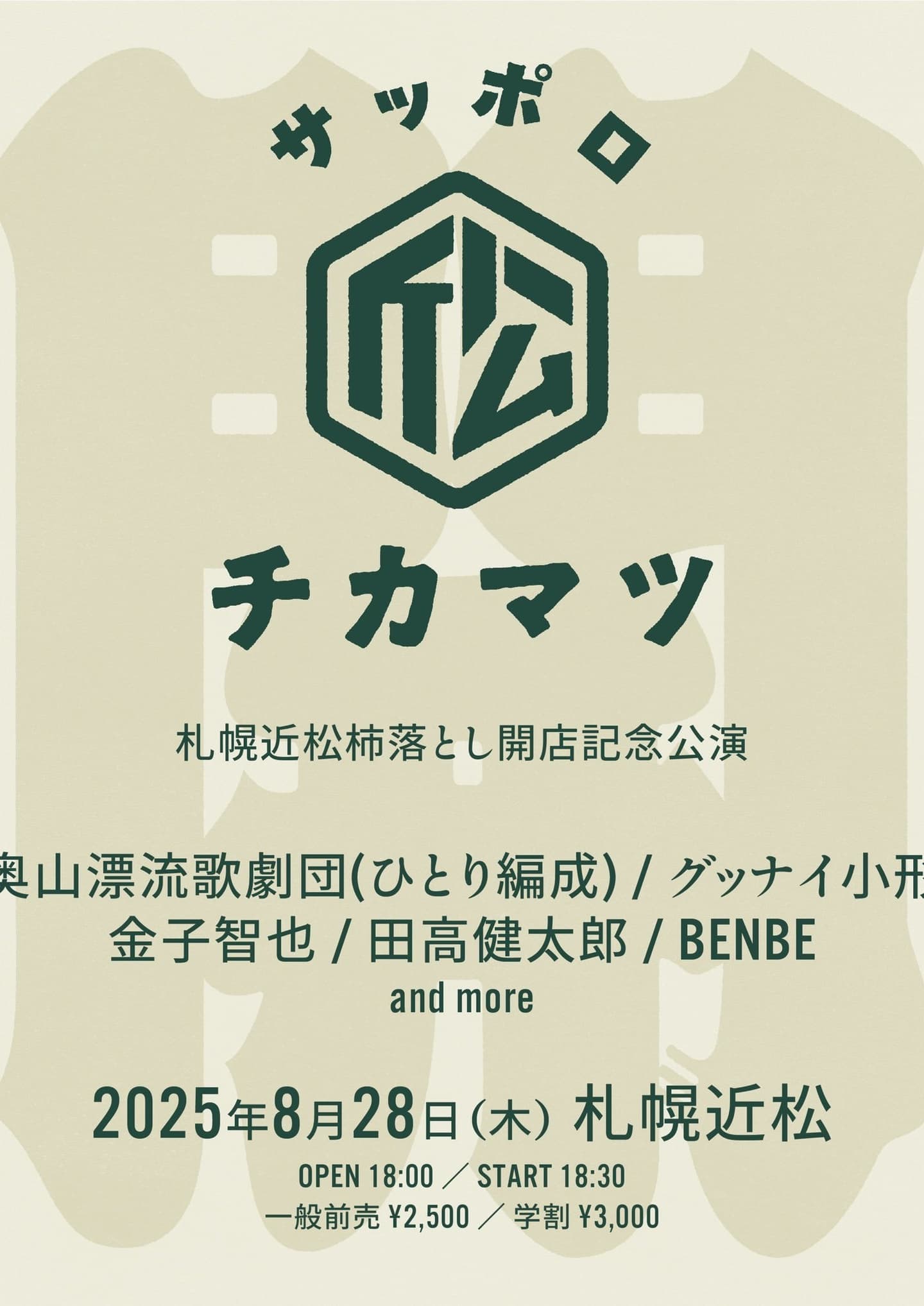 【出演】奥山漂流歌劇団(ひとり編成) / グッナイ小形 / 金子智也 / 田高健太郎 / BENBE / and more...