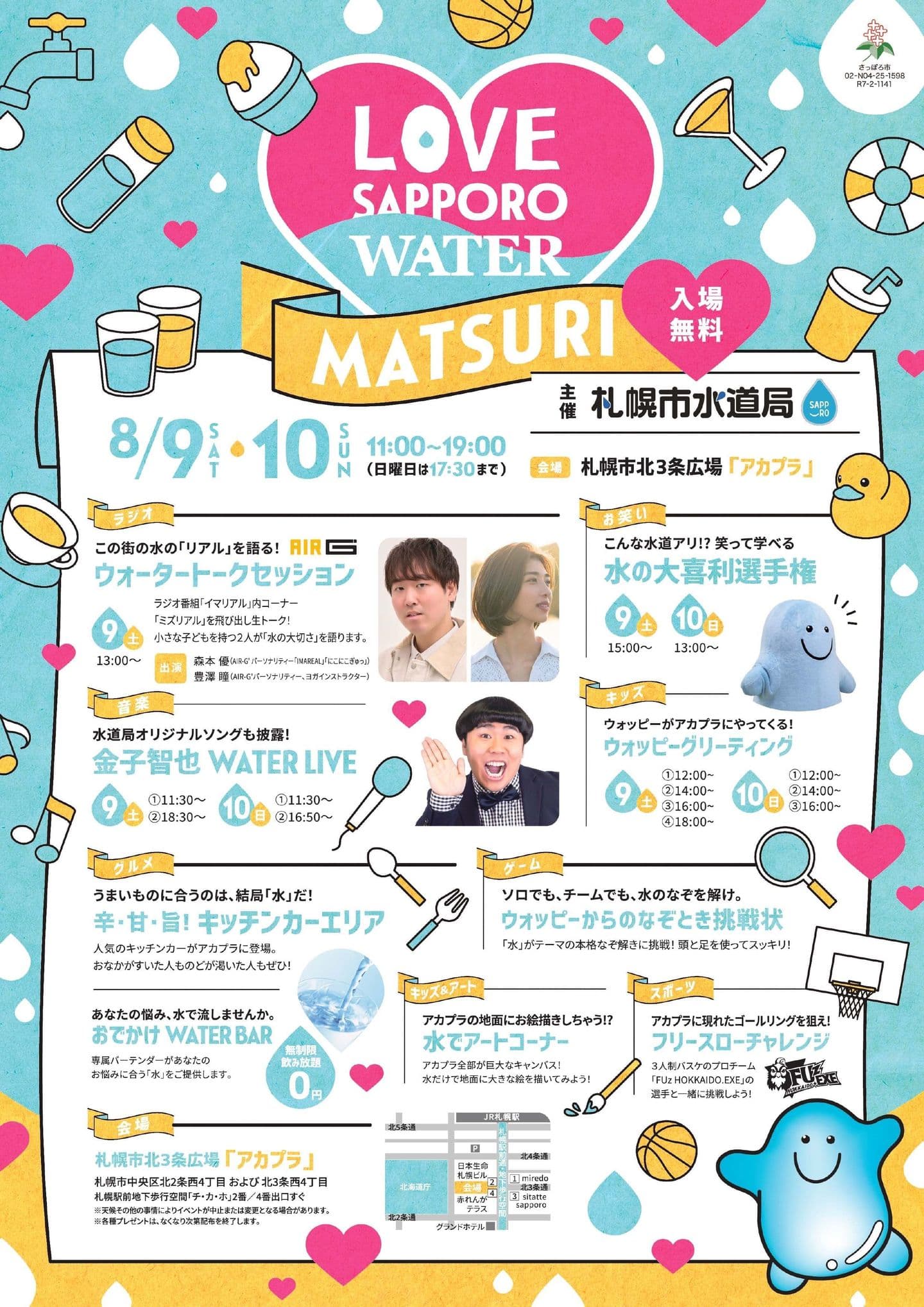 今年も歌っちゃいますよ!しかも2回も!と言いつつゲリラライブもあるので1日3ステージ!2日で6ステージ!他にもAIR-G'パーソナリティ森本さん、豊澤さんによるウォータートークセッションやフリースローチャレンジ、ウォッピーからのなぞとき挑戦状や水の大喜利選手権、キッチンカーなんかもあります!内容もりもりの2日間です!みなさん是非ともお越しくださいませ!!