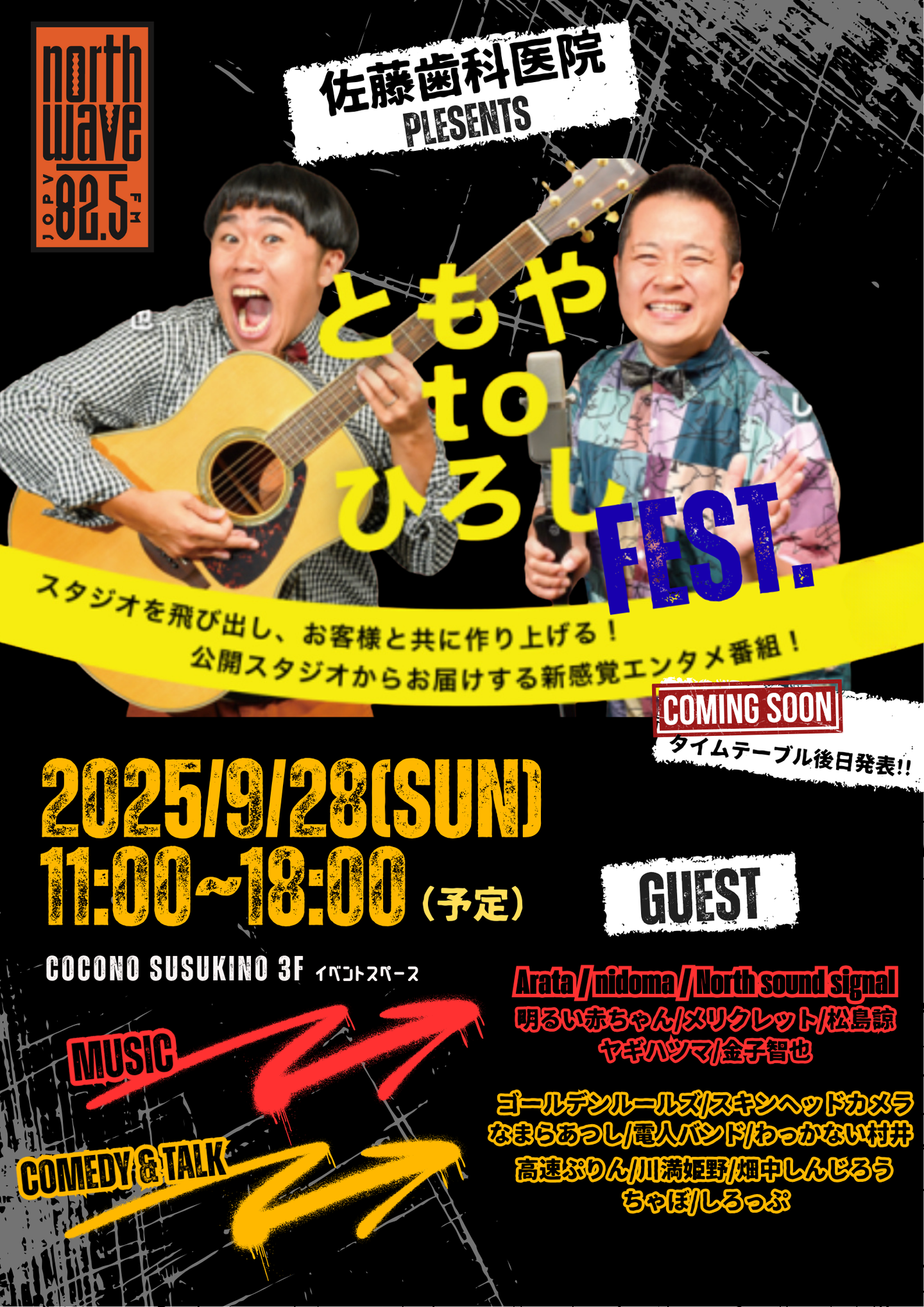 FM NORTH WAVEで放送中の番組「ともやtoひろし(毎週金曜25:30〜)」がフェス開催しちゃいます!場所は毎月第二第四に公開収録をしているCOCONO SUSUKINOの3Fイベントスペース!!